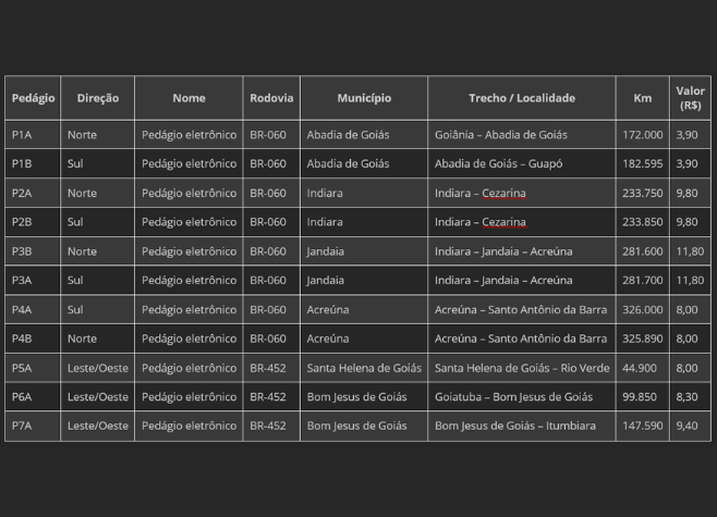 A cobrança ainda depende de autorização da Agência Nacional de Transportes Terrestres (ANTT), mas a previsão é que o sistema entre em funcionamento em maio de 2026. Os valores das tarifas ainda serão divulgados pelo órgão regulador.
